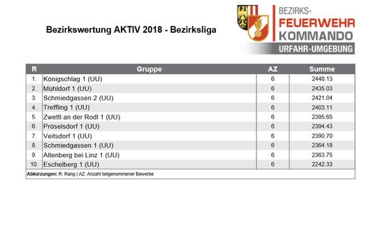 Königschlag wird Bezirkssieger 2018 In der Bezirksliga konnte sich nach drei Bewerben die Feuerwehr Königschlag druchsetzen und darf sich Bezirkssieger 2018 vor Mühldorf und Schmiedgassen nennen.