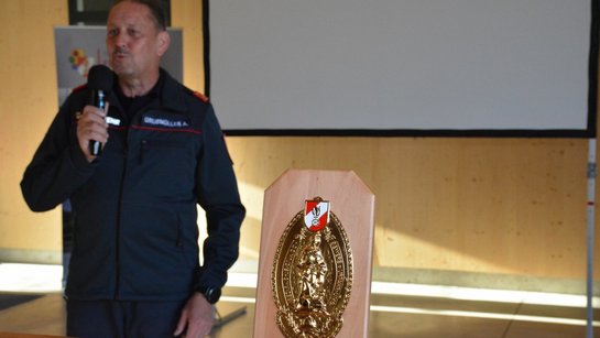 Gemeinsam mit Abschnitts- Feuerwehrkommandant Kurt Reiter wurde abschließend die Bezirksplakette in Gold an Kommandant Alfred Grubmüller und seinen Stellvertreter Wolfgang Steinbichl überreicht.