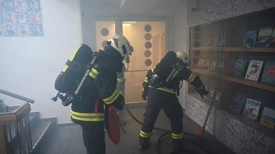 Während die Einsatzkräfte alarmiert wurden, hatten die Schüler unter Anleitung ihrer Lehrkräfte das Schulgebäude geordnet verlassen und sich am Sammelplatz eingefunden. Eine kleine Gruppe Freiwilliger verblieb allerdings zur Rettung im Gebäude. Der eingesetzte Atemschutztrupp konnte den betroffenen Bereich schnell ausfindig machen und die Brandursache identifizieren. Parallel wurden jene sechs Schüler und ihre Lehrkraft, welche im Gebäude verblieben, mithilfe einer dreiteiligen Schiebeleiter aus dem zweiten Obergeschoss in Sicherheit gebracht.