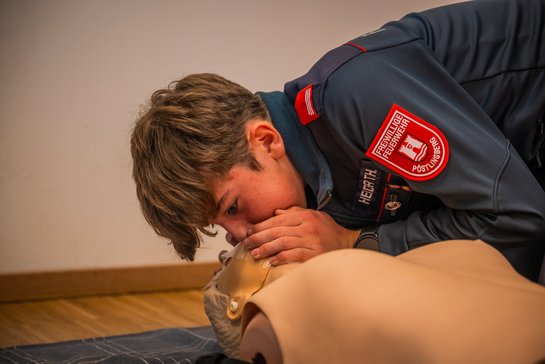 Der zweite Teil, der im Schöffel Schweinbach stattfand, umfasste das Formulieren eines Funkgesprächs, Maßnahmen bei Atem- und Kreislaufstillstand, das Anlegen eines Druck- oder Wundverbandes, die Lagerung bei Bewusstlosigkeit, das Ausführen von Seilknoten sowie eine Alarmierung mittels Telefongespräch.