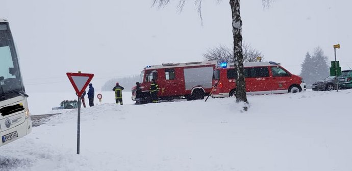 AMESSCHLAG/VWB (09.01. 2019) Die FF Amesschlag wurde gemeinsam mit der Feuerwehr Bad Leonfelden zu einer Fahrzeugbergung alarmiert. Ein besetzter Bus…